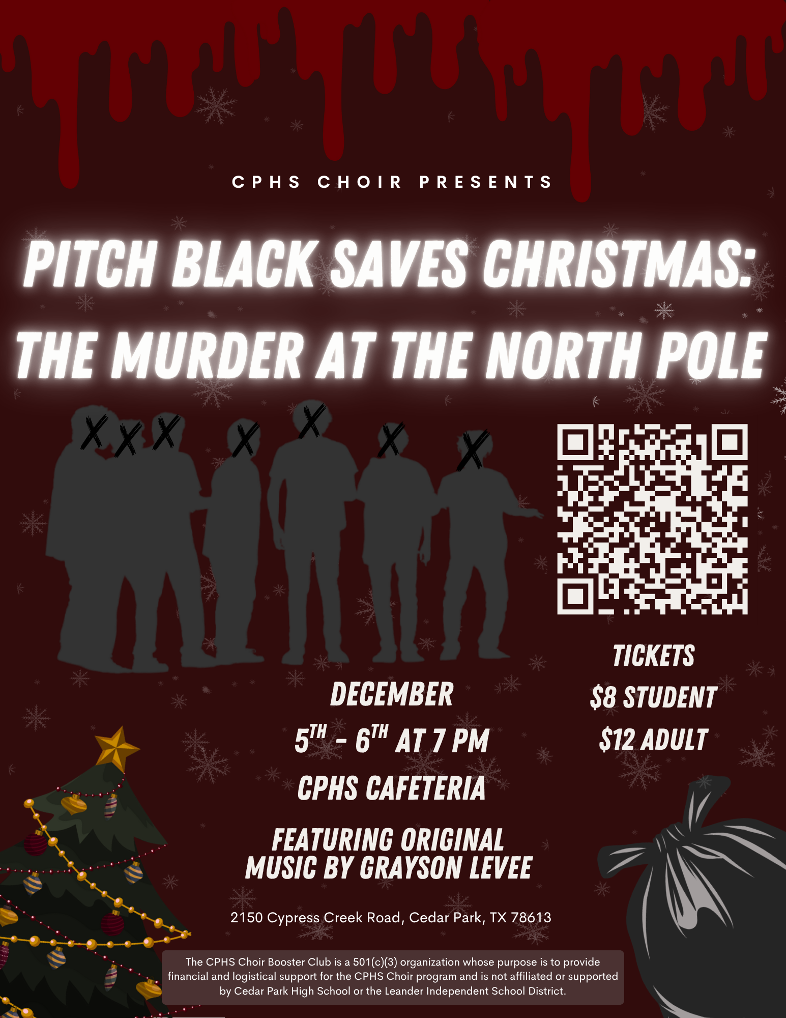 Join the CPHS acapella groups, Pitch Black and Seasons, in the Little Theater on December 5th AND 6th at 7pm for Pitch Black Saves Christmas: The Murder at the North Pole! This hilarious show is entirely written by Pitch Black and geared for all ages to laugh, cry, and enjoy some incredible holiday music. Tickets are $8 for students, $12 for adults.